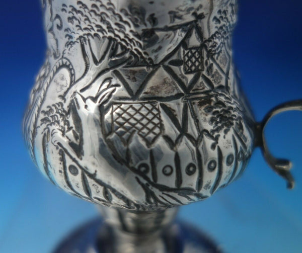 English Georgian sterling silver creamer featuring a repoussed landscape scene with fox and birds, made in London circa 1780 (maker unknown). This piece measures 4 3/8" tall and weighs 2.9 troy ounces. It is monogrammed (see photos). It is being offered in as-is condition due to handle repair. Wonderful piece!