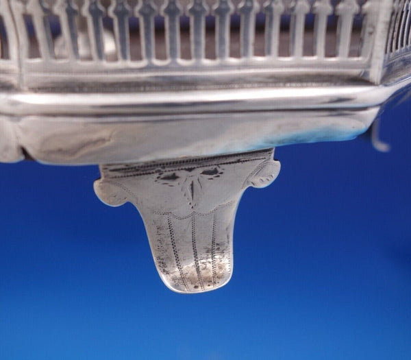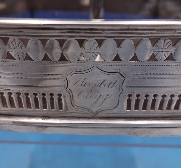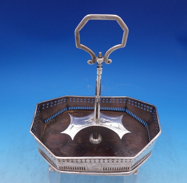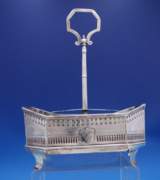 Fabulous English Georgian sterling silver seven piece cruet set with stand made in London circa 1793. This set includes bottles for salt, pepper, mustard, oil, vinegar, and two smaller jars. The stand is pierced and footed, and has a handle and a wood base. This cruet set measures 10 1/2" tall x 7" x 4 3/4". It is monogrammed and is in good vintage condition as shown in the photos, with some wear to the wood as expected with age. Wow!