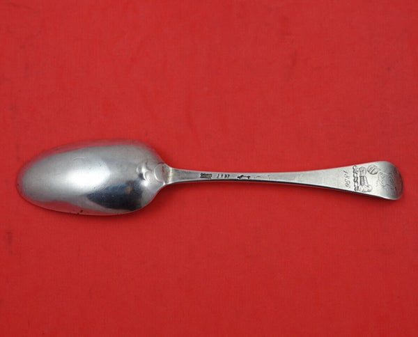 English Georgian sterling silver Dinner Spoon 8" (maker unknown as maker mark worn). This piece has an engraving on the reverse of a knights arm with a date of 1856 (see photos). It is in excellent condition.