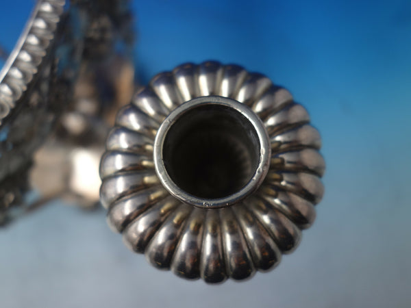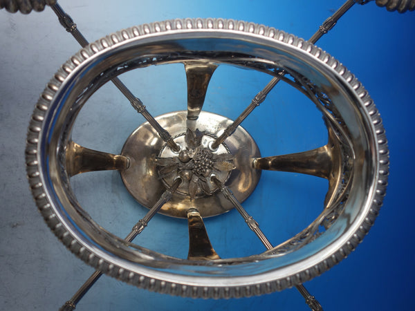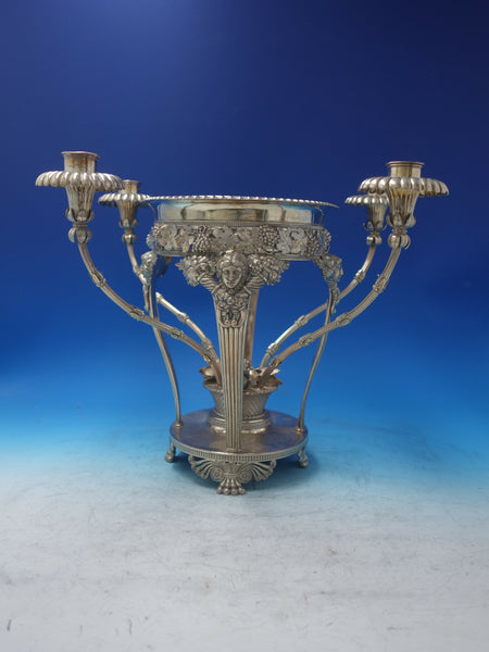 Incredible Georgian English Epergne with 4 candle holder branches made by JW Story W. Elliott, London, c.1812-1813. The design is superbly detailed with high relief Art Nouveau women, cornucopia, applied grapes and grape leaves and vines, and in the center a basket of three dimensional fruit and leaves. The center glass bowl is no longer present. The central oval opening measures 9 3/4" x 7 1/4". The piece measures 13 3/4" x 13" x 12"Ht. It is engraved with a crest and is in excellent vintage condition. Weighs 107 ozt. Fabulous. Museum quality.