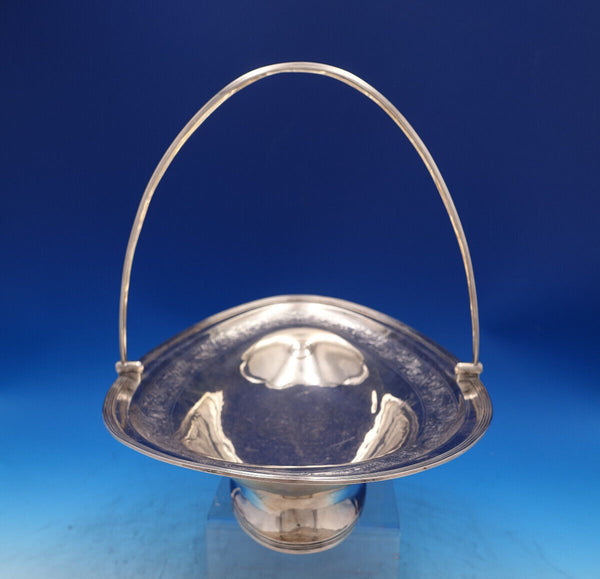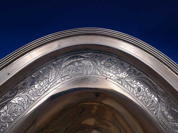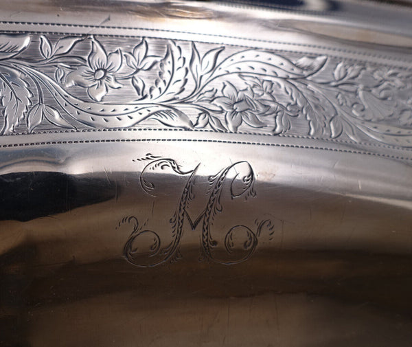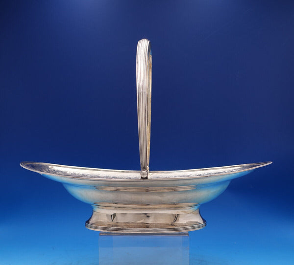 Gorgeous Georgian English sterling silver Swing handle Fruit Bowl with 1 inch border of beautiful hand engraved flowers. This piece is hallmarked for John Emes, London, 1802. It measures 14 5/8" x 9 5/8" x 3 3/4" ht to rim (or 11" to handle when up). This piece weighs 25.7 troy ounces. It is monogrammed (H or M?) as shown and is in good vintage condition. Stunning!