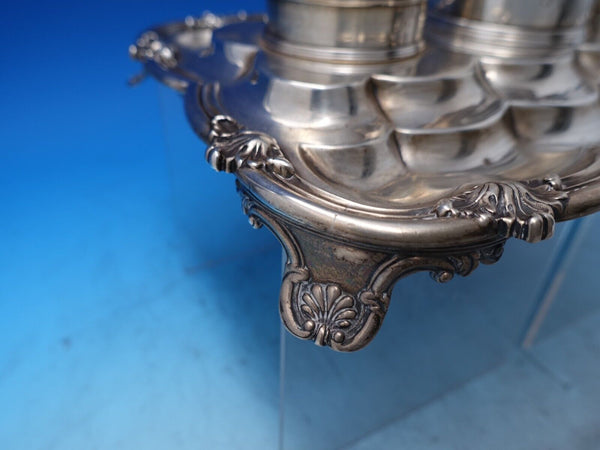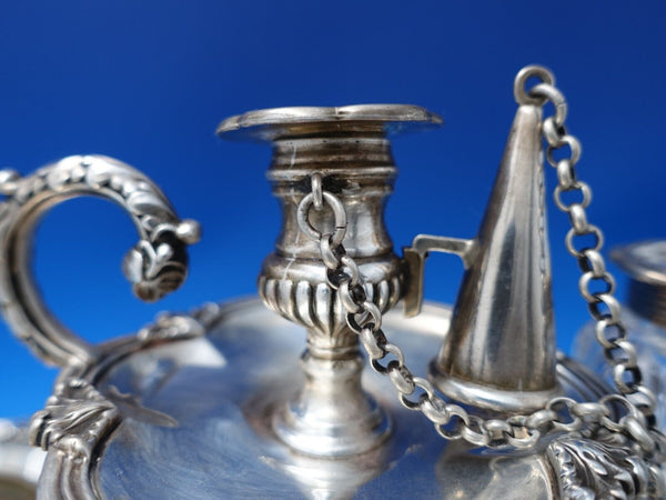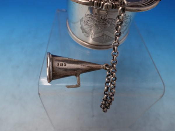 Fabulous English Georgian sterling silver inkwell on footed tray with glass inkwell and candle holder with snuffer cap by Joseph Argell, London, 1829. This piece measures 11" x 8" and weighs 36 troy ounces. It is monogrammed with engraved crests and is in good vintage condition. Exceptional!