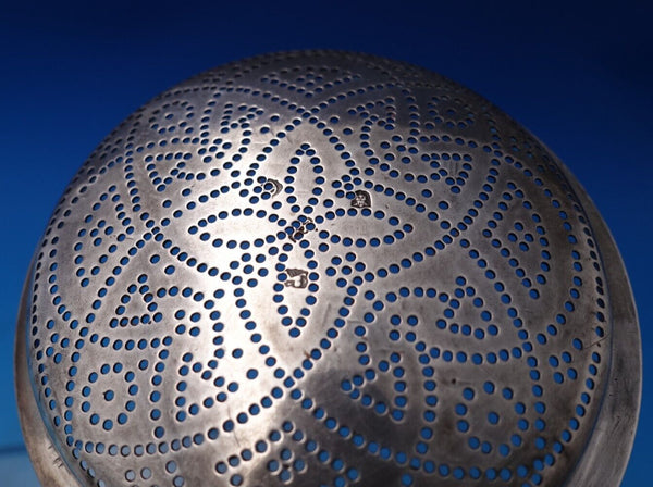 Superb English Georgian sterling silver fancy pierced lemon squeezer, circa 1762 (maker unknown). This lemon squeezer measures 6 3/4" x 4". It is not monogrammed. It is in good estate condition as shown in the photos, with some repairs around underside of rim. Wonderful piece!