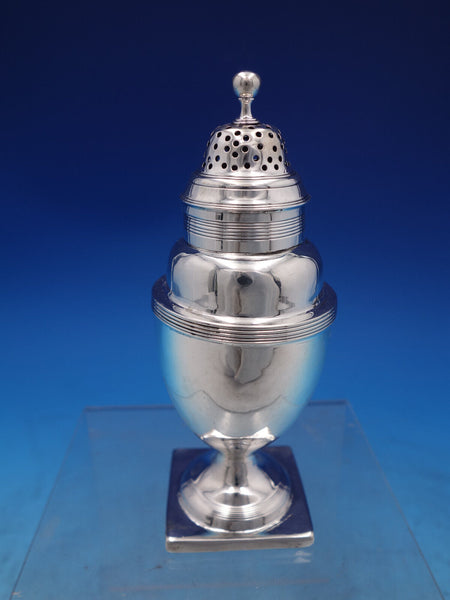 Georgian sterling silver muffineer with square base, made in London in 1810 by Stephen Adams. This piece measures 5 3/4" tall and weighs 2.99