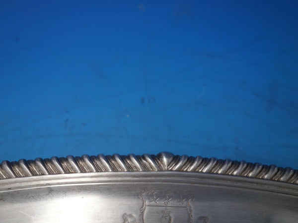 Gorgeous sterling silver platter by unknown maker of London, circa 1821. The platter measures 17 1/2" x 14 3/8 " x 1 1/8" and weighs 69.7 troy ounces. It has an engraved family crest (see photos), and is in good vintage condition. This platter will be beautifully polished prior to
