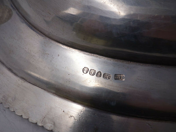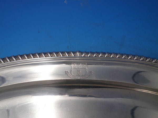 Gorgeous sterling silver platter by unknown maker of London, circa 1821. The platter measures 19 1/2" x 15 1/4 " x 1 1/8" and weighs 86.5 troy ounces. It has an engraved family crest (see photos), and is in good vintage condition. This platter will be beautifully polished prior to
