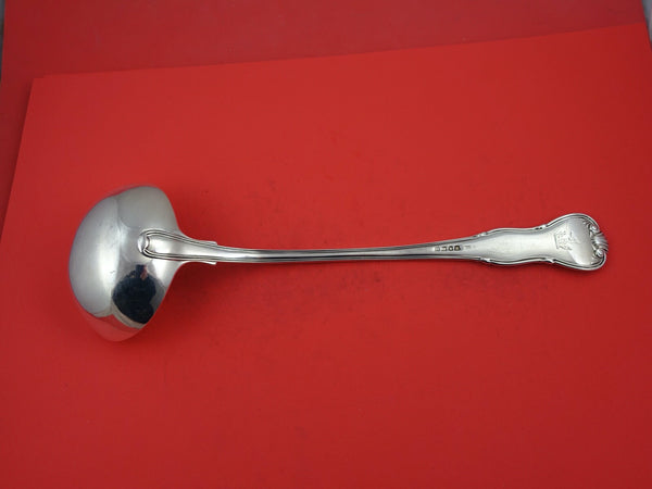 English Georgian sterling silver Soup Ladle, hush shell pattern 1827 London makers mark worn engraved griffin family crest on reverse 13 3/8". It is monogrammed (monos vary) and is in excellent condition.