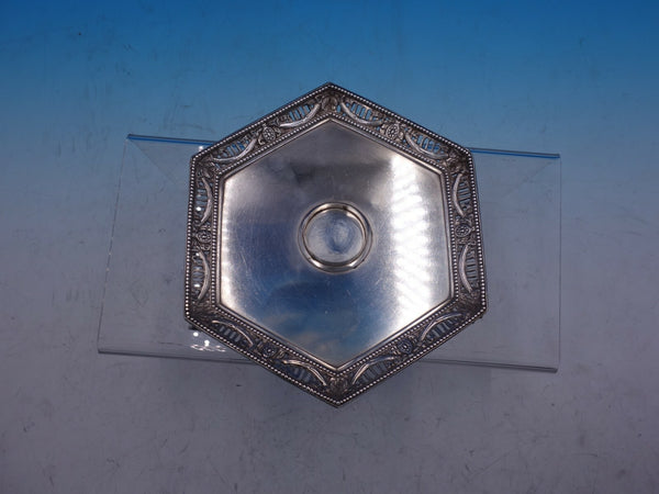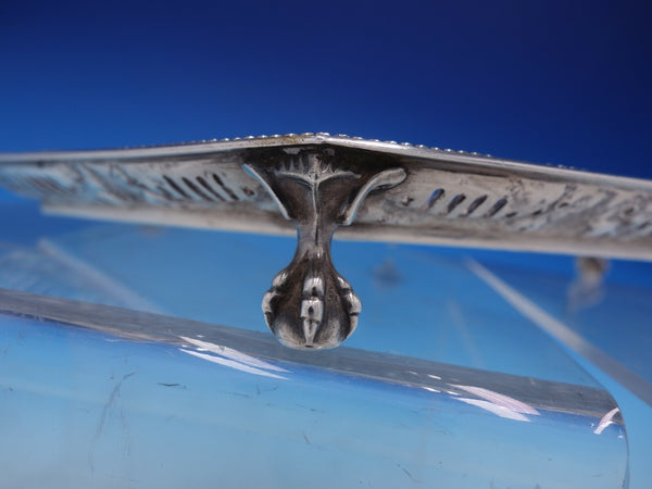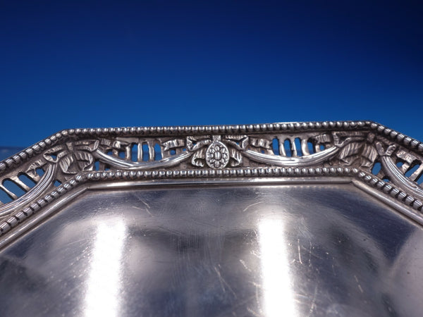 English Silver tray for inkwell with pierced border decorated with ribbons, rosettes, and swags and 3 applied lion feet from London. The date mark is unreadable. The tray measures 3/4" x 5 1/4" and weighs 9.54 ozt. It is not monogrammed and is in good vintage condition. Beautiful piece!