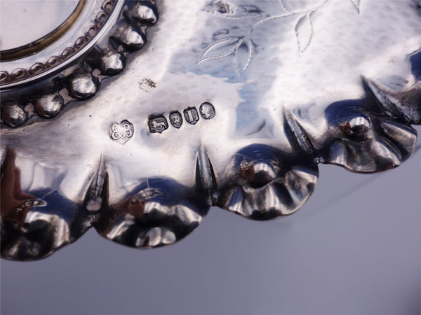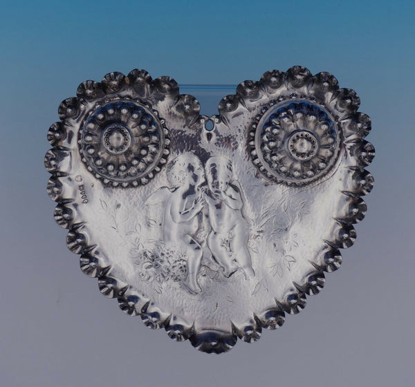 Charming Edward Brown of London sterling silver 3-piece inkwell set, circa 1886. The set includes two glass wells with sterling tops and a heart-shaped sterling silver tray. The tray has repoussed cherubs, four feet, and weighs 7 troy ounces. This piece measures 8" x 7 1/2" x 3/4", is not monogrammed, and is in excellent condition. Fabulous!