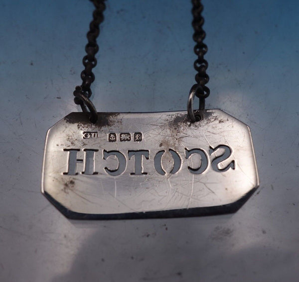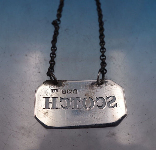 Wonderful English sterling silver liquor label made in Birmingham circa 1905 (maker unknown). This label measures 1 3/8" x 3/4" and weighs .25 troy ounces. It is pierced "Scotch" (see photos), and is in good vintage condition as shown in the photos.