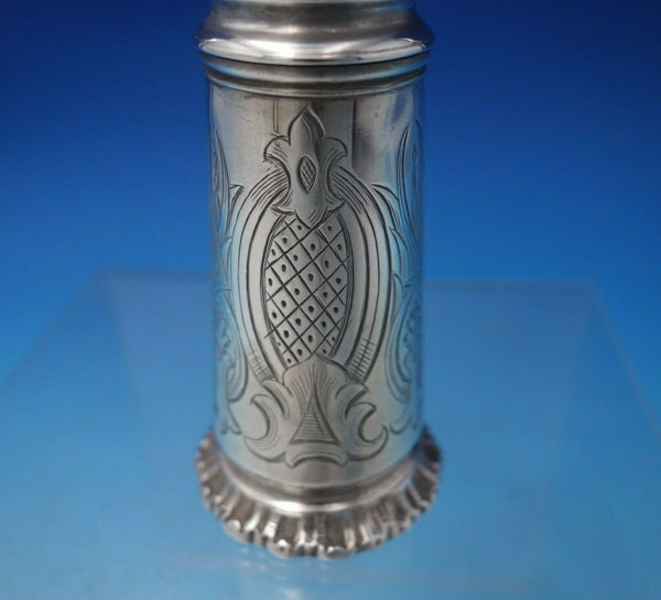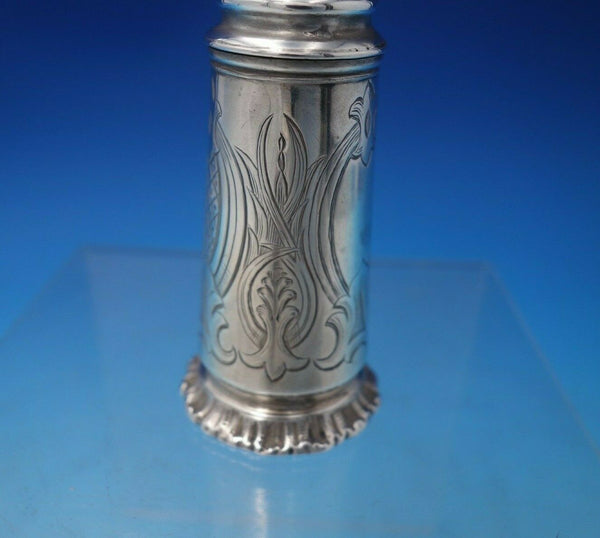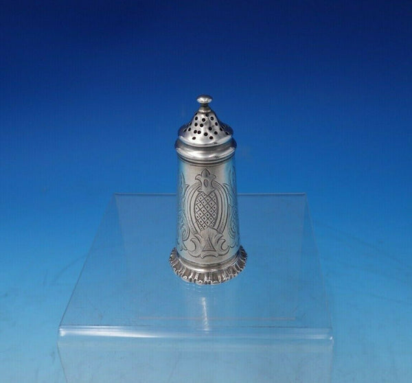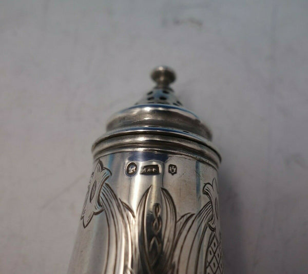 English sterling silver bright-cut pepper shaker (maker unknown). This piece measures 3 3/4" tall x 1 5/8" and weighs 1.8 troy ounces. It is not monogrammed and is in good vintage condition. Spectacular piece!