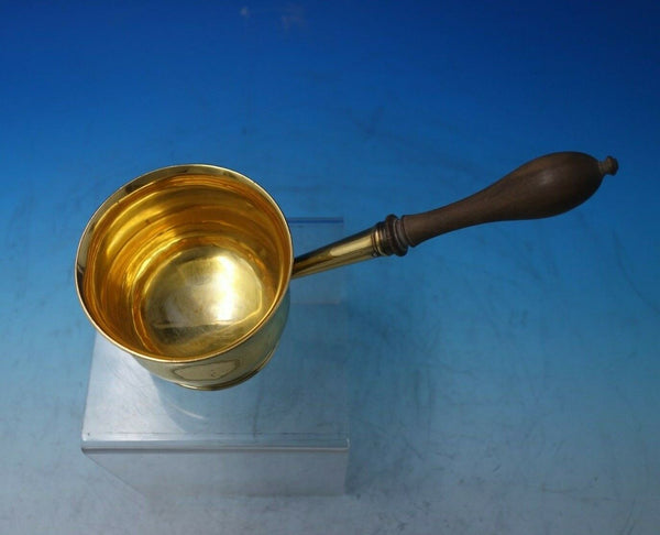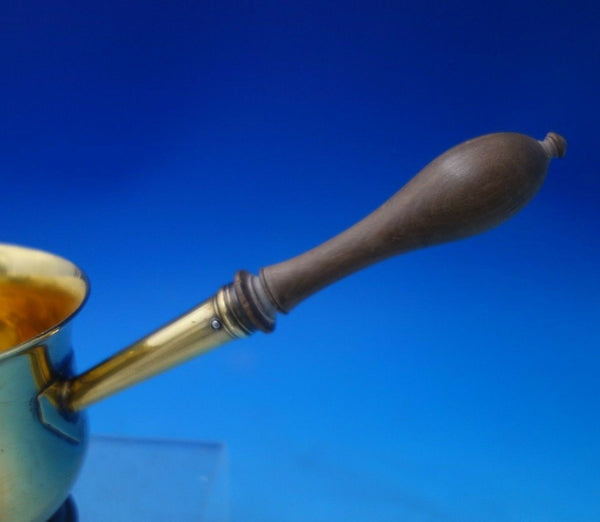 Beautiful English sterling silver vermeil (completely gold washed) pipkin with wood handle made in England (maker unknown). This piece measures 3" x 8" and weighs 6.1 troy ounces. It is not monogrammed and is in good vintage condition as shown in the photos, with some wear to the wood as can be expected with age. Terrific!