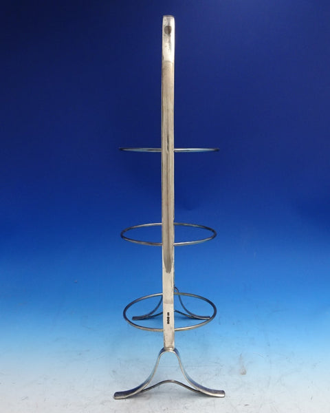 Superb English sterling silver three-tier plate stand (maker unknown). This stand measures 18" tall x 9 1/4" and weighs 24 troy ounces. It is not monogrammed and is in good estate condition as shown in the photos. Terrific!