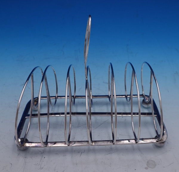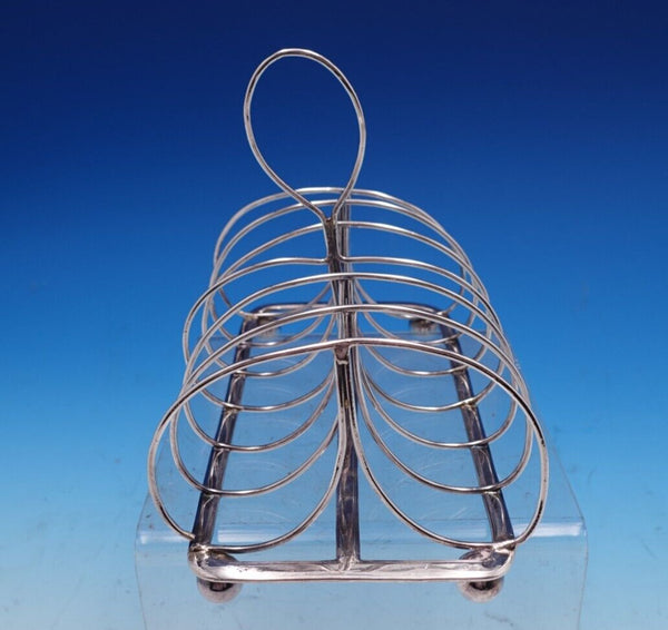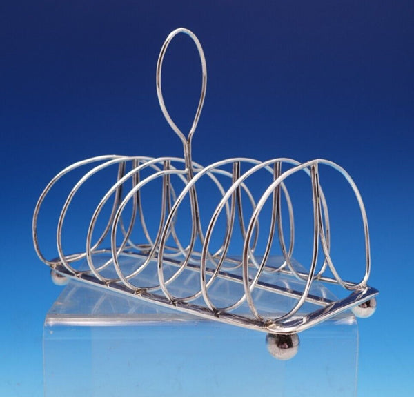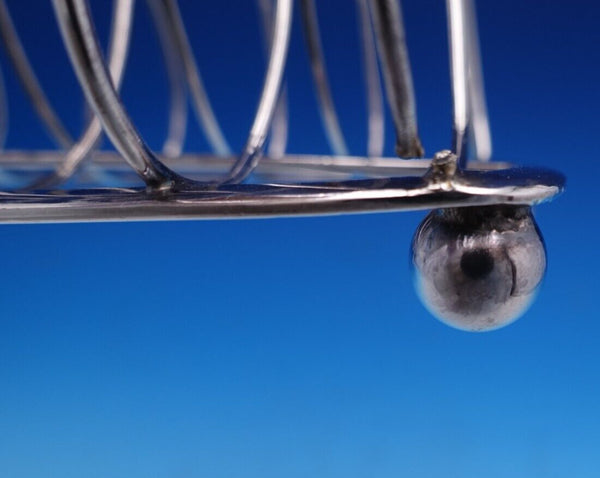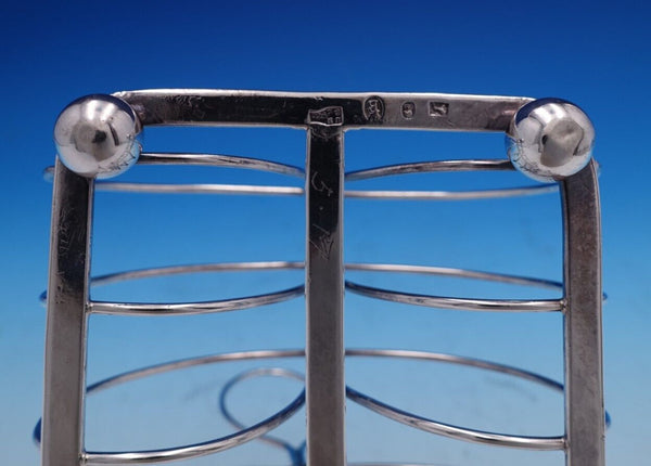 Wonderful English sterling silver toast rack with ball feet (maker unknown). This piece measures 5 1/2" (h) x 6" (l) x 4" (w) and weighs 5.7 troy ounces. It is not monogrammed and is in good estate condition. Terrific piece!
