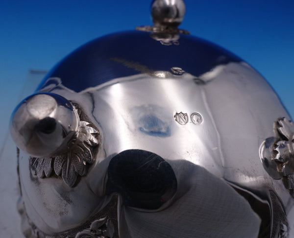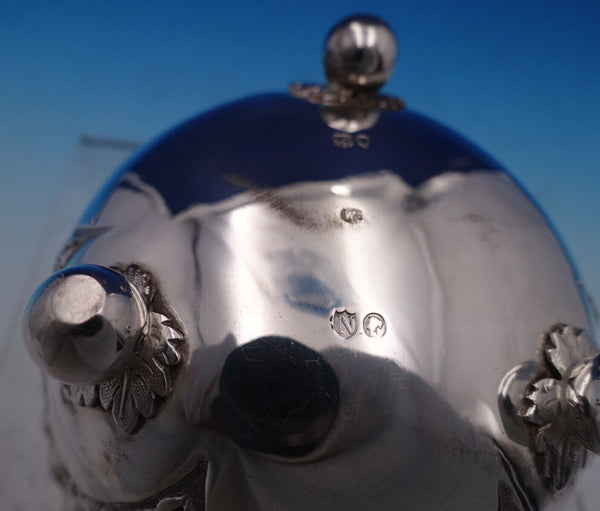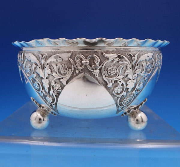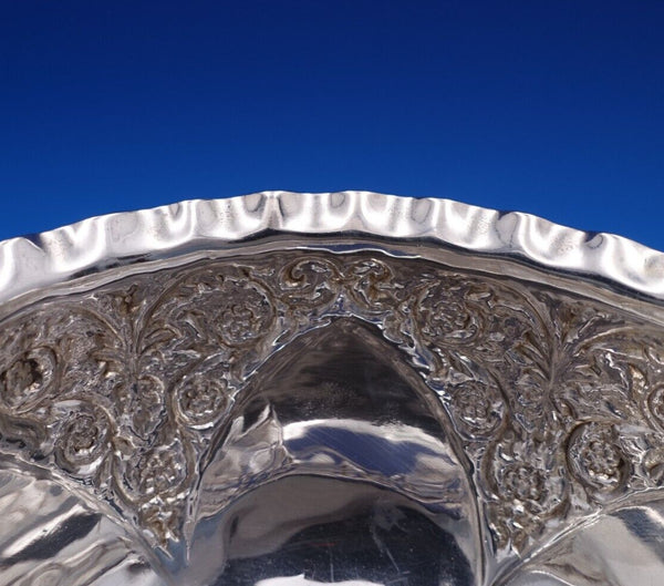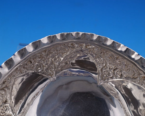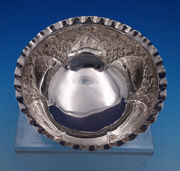 Lovely English Victorian sterling silver candy dish made in London circa 1888 (maker unknown, possibly "WE"). This dish features a pie crust crimped edge and repoussed scrollwork and has three ball feet. It measures 2 1/4" tall x 4 3/8" and weighs 3.65 troy ounces. It is not monogrammed and is in good estate condition. Gorgeous!
