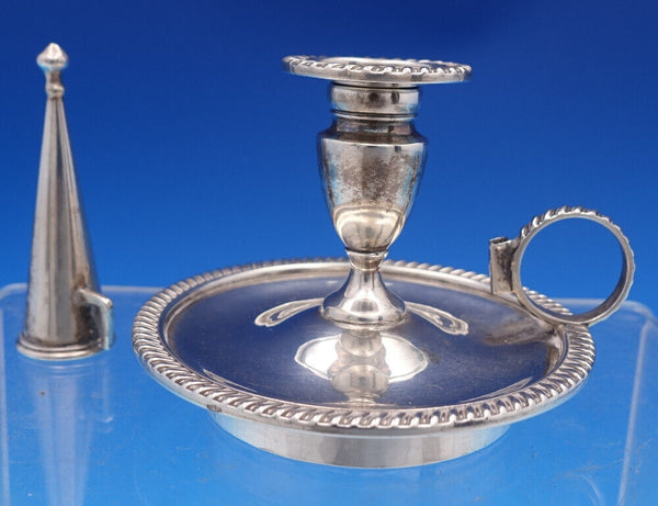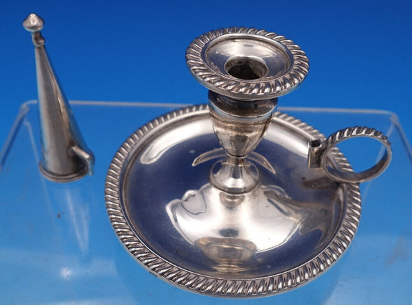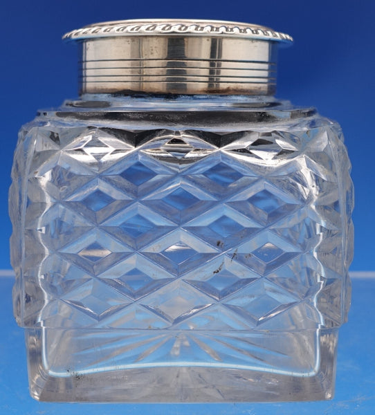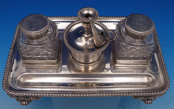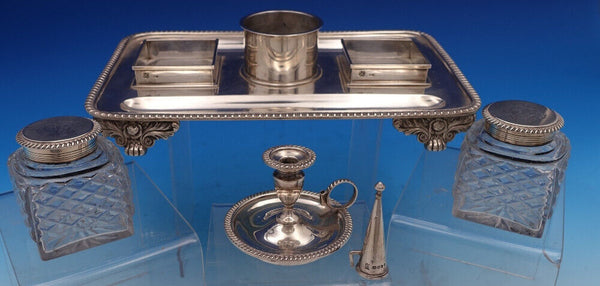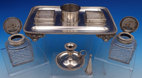 candle holder and snuffer, 2 glass inkwells with silver lids engraved with bust