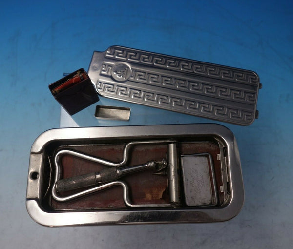 Exceptional Etruscan stainless razor in original box, circa 1920 (made in England; maker unknown). This razor measures 6" x 2 1/2". The razor is not monogrammed and is in good vintage condition as shown in the photos, with the box offered in as-is condition due to wear expected with age. Fabulous!