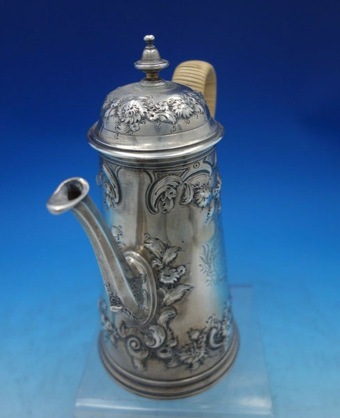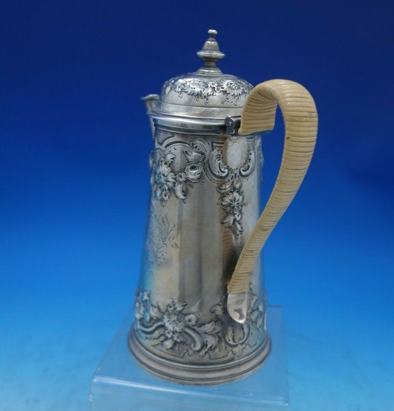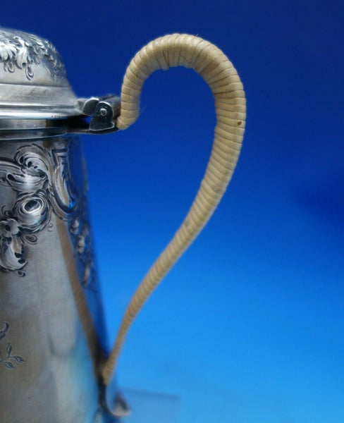 Remarkable European sterling silver tea pot featuring repoussed and chased flowers and a wrapped rattan handle (maker unknown). This pot measures 8 1/2" tall and weighs 23 troy ounces.