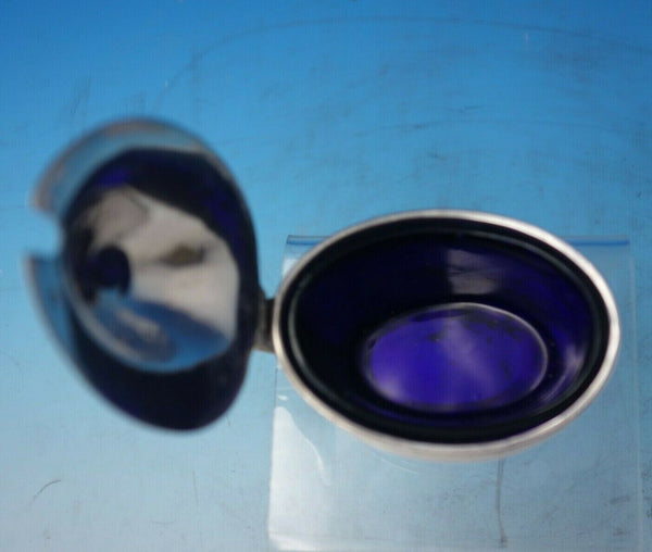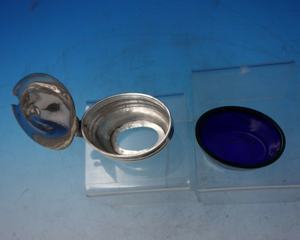 Wonderful George III by John Emes sterling silver mustard pot bright-cut with blue liner, circa 1803. This pot measures 3 1/4" tall x 4 1/4". It is monogrammed with crest and man with shovel (see photos), and is in good vintage condition. Marvelous!