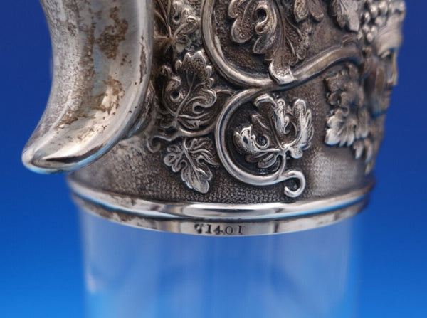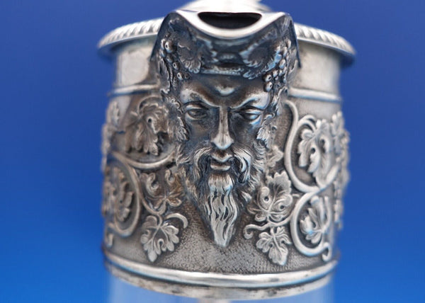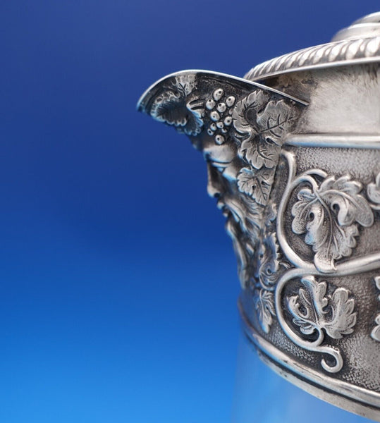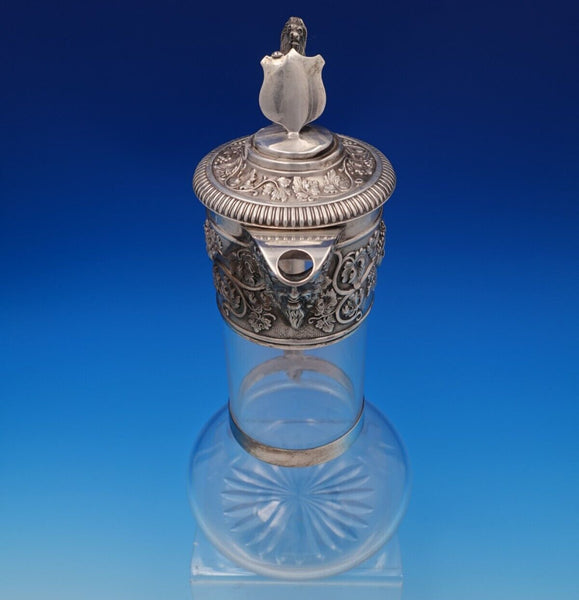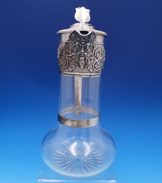 Exceptional Horace Woodward and Co sterling silver and glass claret wine decanter pitcher made in London circa 1898. This piece features a 3-D lion finial with shield. It also has a man's bearded face on the spout, and grapes and vines with two faces on the beautiful wide border.