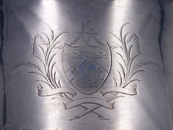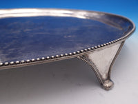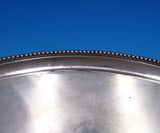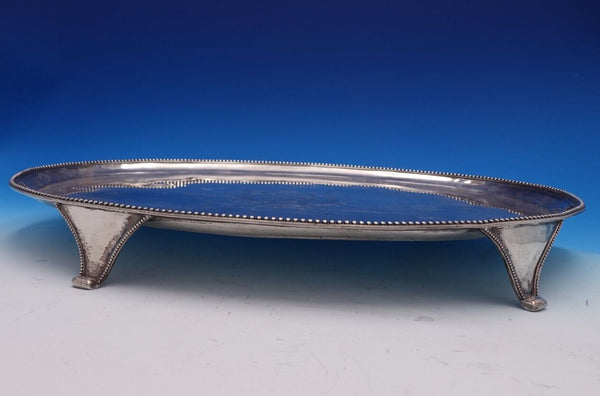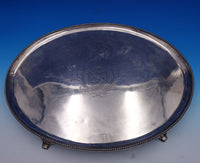 Wonderful Hester Bateman English Georgian sterling silver oval tray with beaded rim and four feet, circa 1789. This tray measures 2 1/4" x 19 1/4" x 14 3/4" and weighs 54.8 troy ounces. It has an engraved family crest with boar heads (see photos), and is in good estate condition. This piece will be beautifully polished prior to