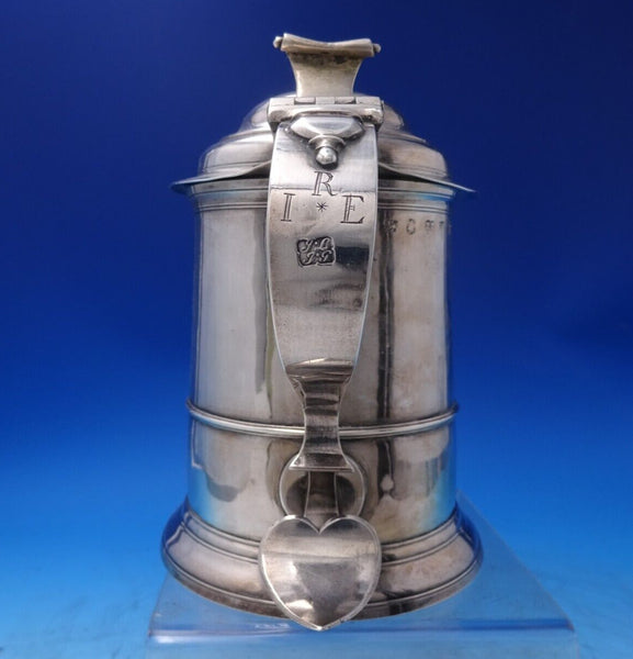 Fabulous John Langlands and John Goodrick English Georgian sterling silver tankard, Newcastle, circa 1756. This tankard features a lid with heart at base of handle. It measures 6 3/4" tall x 6 1/2" and weighs 18.98 troy ounces. It is monogrammed on the handle (see photos), and is in good estate condition as shown in the photos. Marvelous piece!