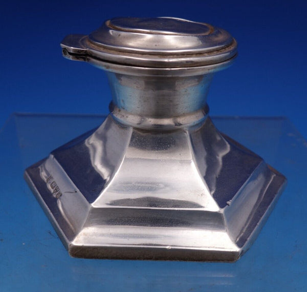 Superb James Deakin and Sons sterling silver inkwell with six sided base made in Chester, England, circa 1911. This inkwell measures 2" tall x 3" and is weighted. It is not monogrammed and is in good estate condition as shown in the photos with some dents on the lid. Wonderful!