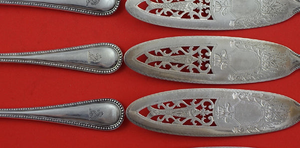 Exceptional sterling silver flat handle all sterling bright-cut Fish Set 12-Piece by Martin Hall and Co, Sheffield, circa 1868. This set includes six knives and six forks with beaded trim on the handles. The knives also feature pierced fish on the blades. The pieces are monogrammed (see photo), and are in excellent condition. Wonderful!