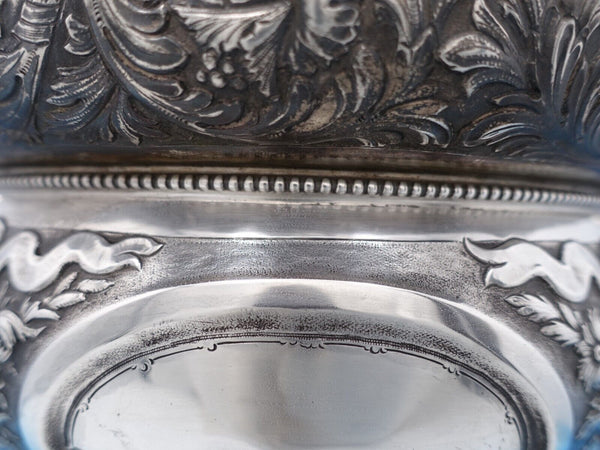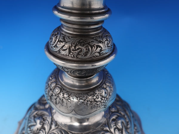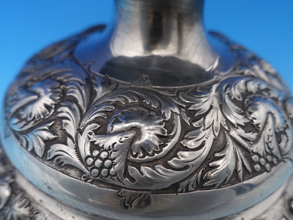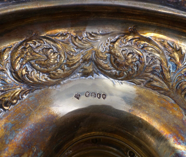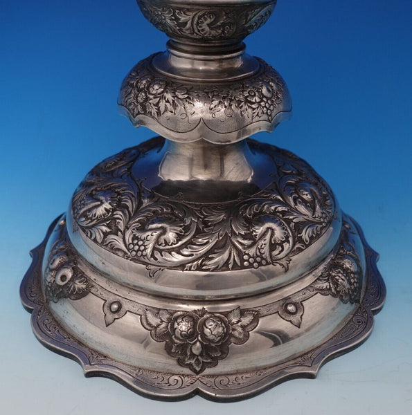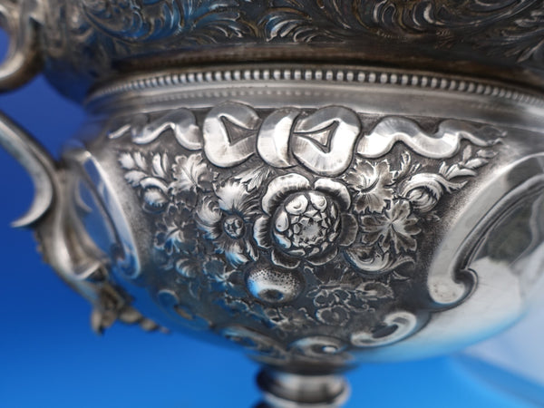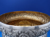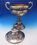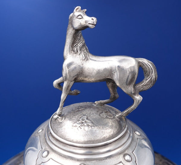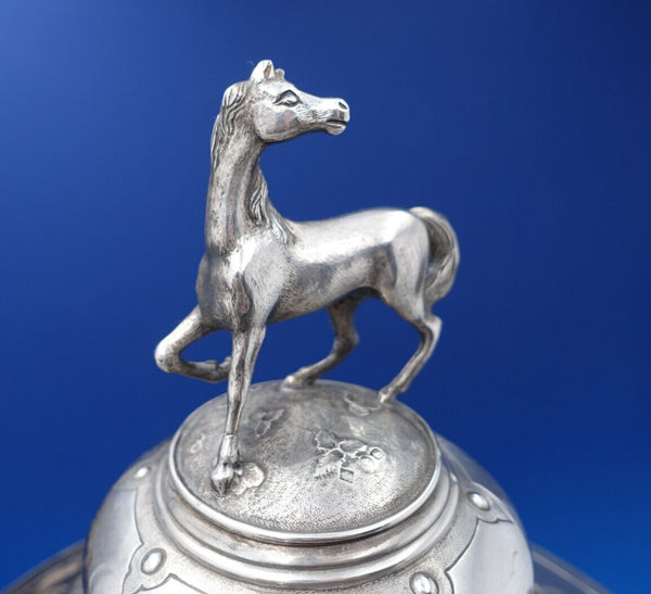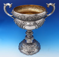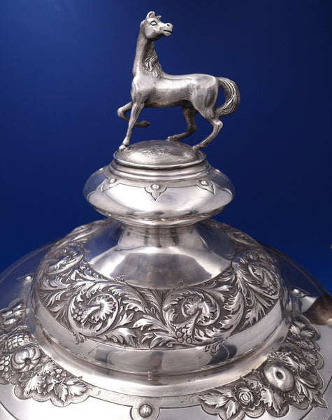 Impressive Martin Hall and Co English Victorian sterling silver trophy made in London, England, circa 1886. This piece features a 3-D horse finial with repousse flowers, fruit, ribbons, and scrollwork. It also has a gold washed interior.
