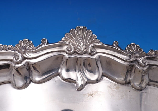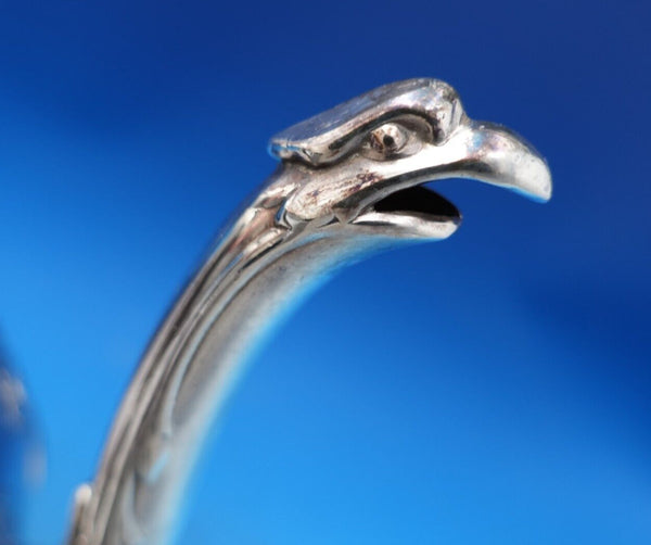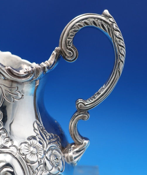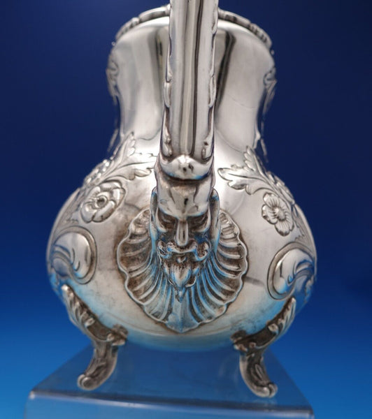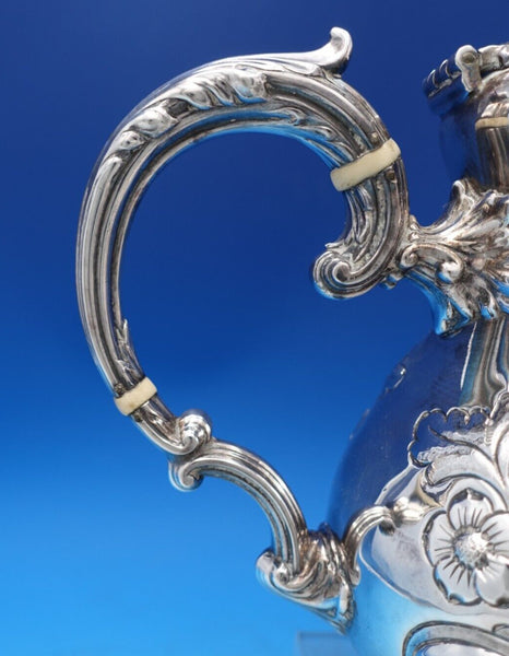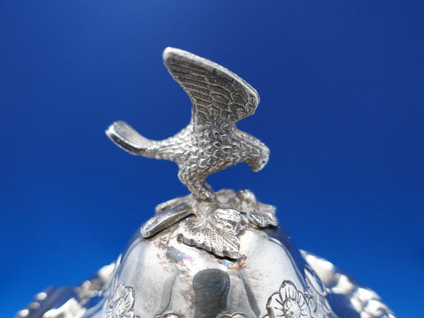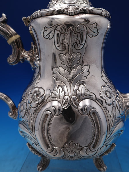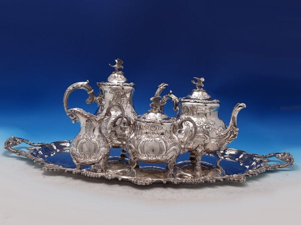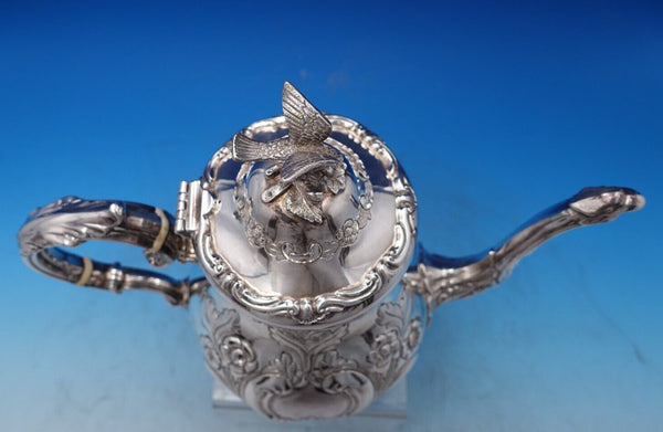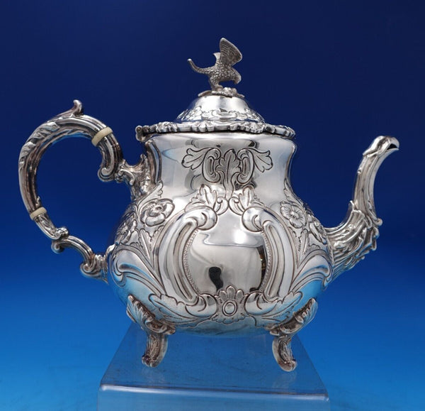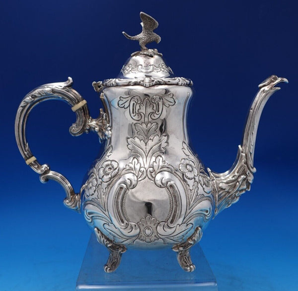 Spectacular Robert and Belk sterling silver five-piece tea set made in Sheffield, England, circa 1977. This set features 3-D eagle finials, repousse flowers, scrollwork, face of man on base of spout, and shell borders. This set includes: