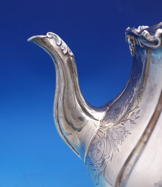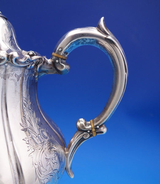 Beautiful Robert Harper English Victorian sterling silver four-piece tea set with silverplate tray made in London circa 1858. This set is bright-cut and features a 3-D bird finial on the pots. This set includes: