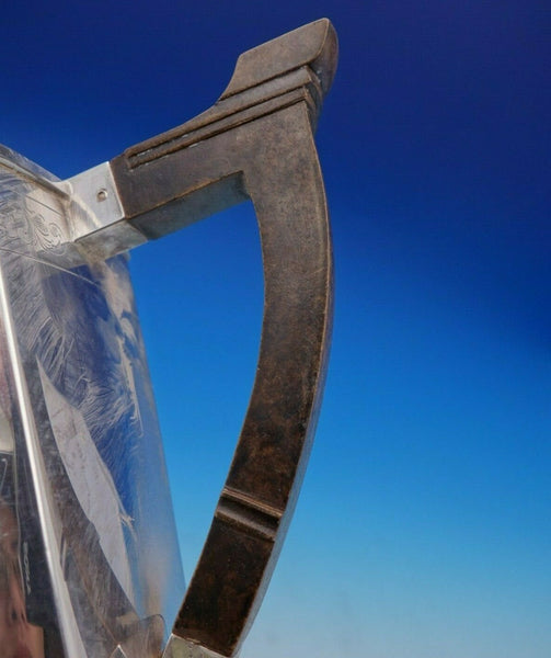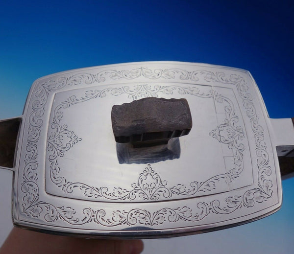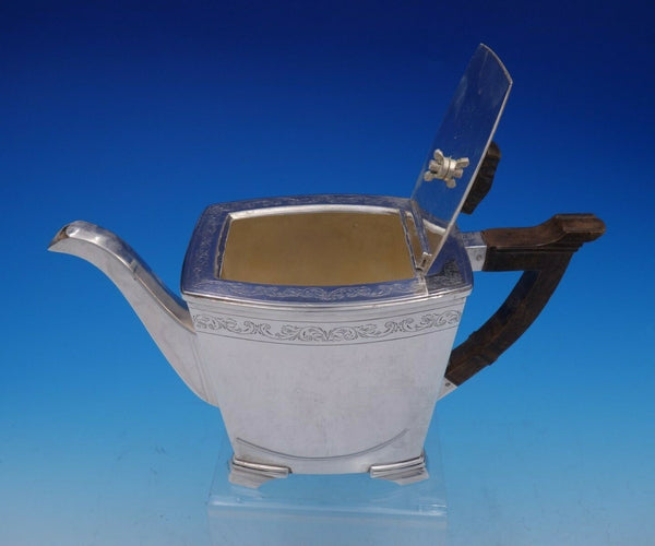 Extraordinary Stower and Wragg English sterling silver 4-piece tea set with wood handles and finials and hand engraved border. It was made in Sheffield, is marked #931518, and has date mark for 1940. This set includes: