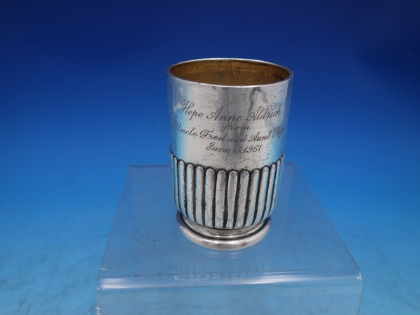Charming English sterling silver baby cup by unknown maker, London circa 1889. This cup measures 3 1/2" tall x 3 1/2 x 2 1/4" in diameter at the top, and weighs 3.97 troy ounces. It is monogrammed (see inscription, dated 1951) and is in good vintage condition. Fantastic!