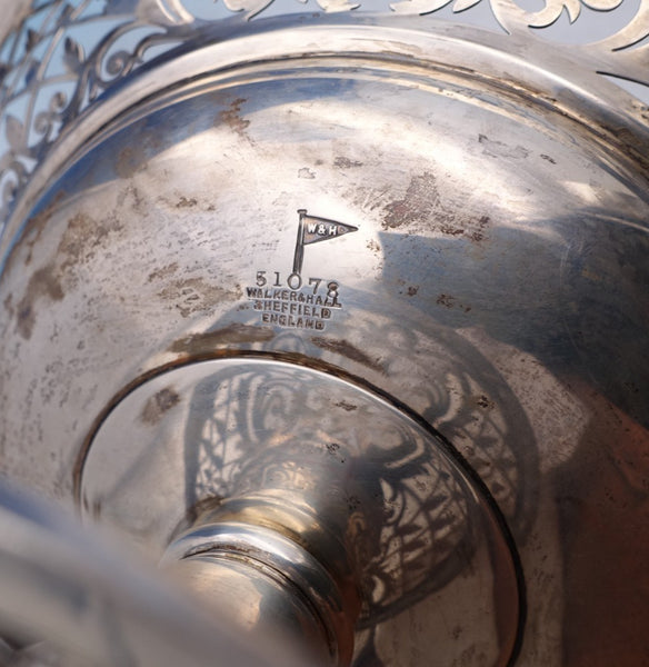 Beautiful Walker and Hall English estate sterling silver fruit basket marked #51078, made in Sheffield circa 1912. This piece features a crossed ribbon border (1 1/2" pierced border), swing handle, and a pedestal base.