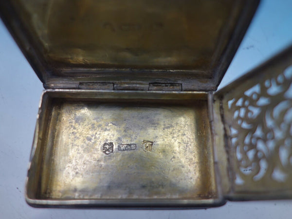 Beautiful WS = William Simpson from 1826 Birmingham, England, sterling silver box with hand engraved design and pierced screen. This piece measures 1 1/2" x 1" x 3/8" and weighs 0.76 troy ounces. It is not monogrammed and is in good vintage condition as shown in the photos with repair to screen hinge. Wonderful!