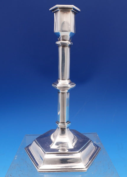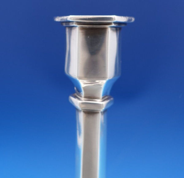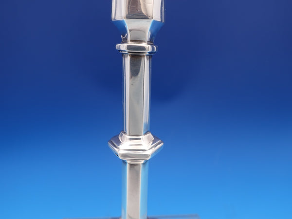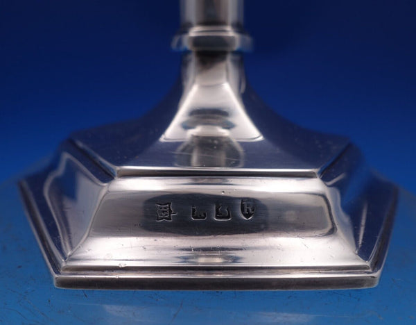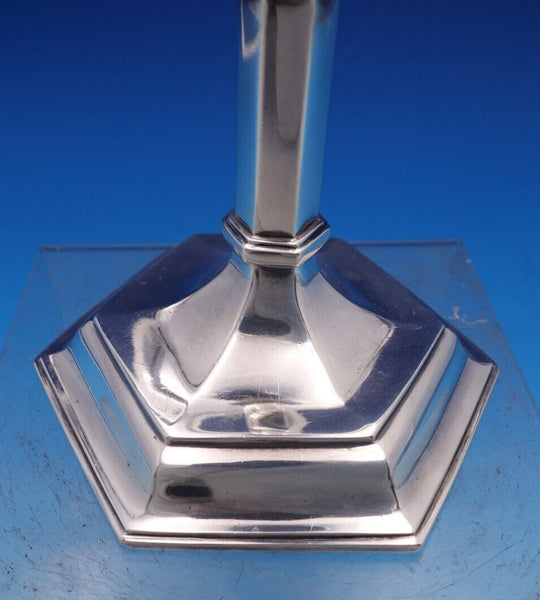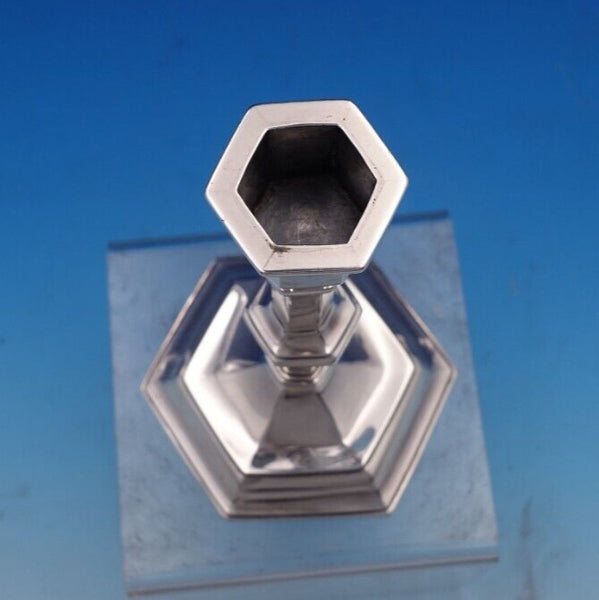 Exceptional William Hutton and Sons English Victorian all sterling silver candlestick pair circa 1892. The pieces feature a six-sided hexagon shape, measure 7 1/2" tall x 3 3/4" (base), and weigh 11.40 troy ounces. They are not monogrammed and are in good estate condition as shown in the photos. Outstanding!