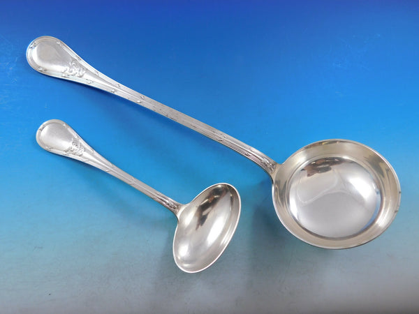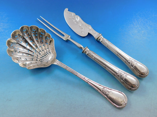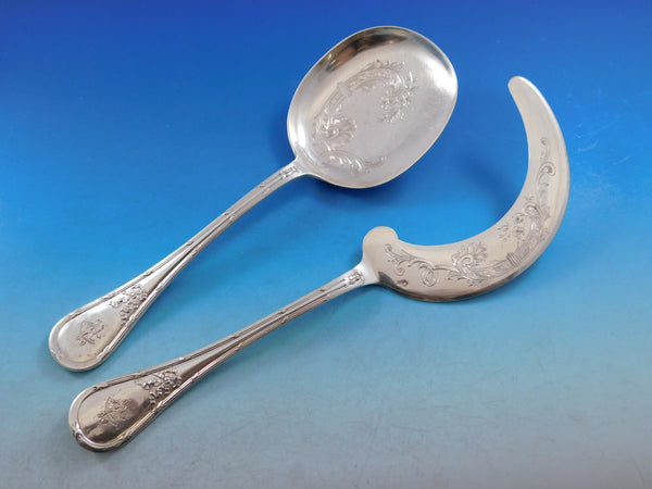 Beautiful AUSTRIAN 800 Silver Flatware set with bow and ribbon design - 79 pieces. This set includes: 12 Large Dinner Knives w/stainless blades, 10 1/2" 12 Massive Dinner Forks, 8 1/4" (heavy 2.9 ozt each) 6 Regular Knives w/stainless blades, 6" (they do not fit in the slots perfectly) 6 Regular Forks, 7" ( 4 rounded, 2 pointed) 8 Teaspoons, 5 3/8" (pointed) 6 Place Soup Spoons, 7 1/8" (5 rounded, 1 pointed) 5 Demitasse Spoons, 4 1/2" 6 Massive Dinner Spoons, 8 5/8" (heavy 3 ozt each) 6 Fruit Knives w/stainless blades, 7 1/4" 1 Buffet Fork, 2-tine, 9 7/8" 1 Pierced Pea Spoon, 7 1/2" 1 Berry Spoon, bright cut, 8" 1 Large Vegetable Spoon, 10" (heavy 4.4 ozt) 1 Roast Beef Fork, hollow handle with stainless tines, 8 1/4" 1 Gravy Ladle, 7" 1 Aspic Slice, bright cut, 10 1/4" 1 Cheese Knife, hollow handle w/plated blade, bright cut, 7 1/2" 1 Soup Ladle, 12 1/2" (massively heavy 8.7 ozt) 2 Master Salt Spoons, 3 1/8" 1 Master Salt Dip, 2" Includes vintage fitted chest. Overall very good vintage condition. There are two styles of handle designs. Most pieces have a rounded handle, 12 pieces indicated have pointed handles. The rounded pieces have matching monograms and the more pointed pieces have varying monograms. This set will be beautifully polished and sealed in individual plastic sleeves prior to Listed with ExportYourStore.com