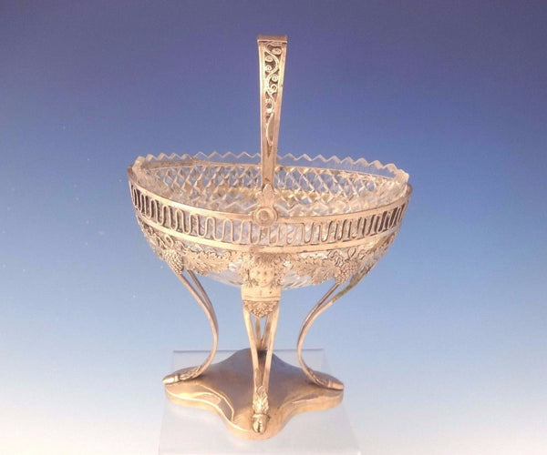 German .800 silver sweet meat dish on raised pedestal base with cut crystal bowl. The frame is decorated with grapes and vines. The piece measures 5 1/4" tall with the handle down, 5 1/2" wide, and the silver weight is 7.5 ozt. The dish dates from the 1890's. It is not monogrammed and is in excellent condition. SKU #0046.