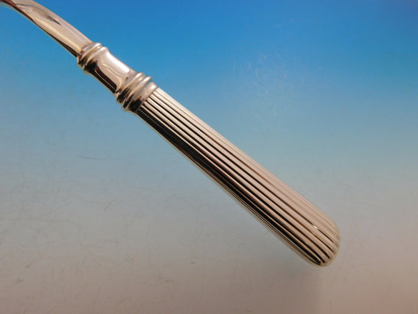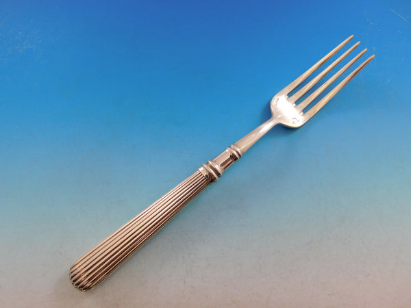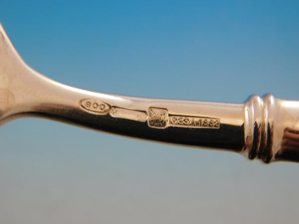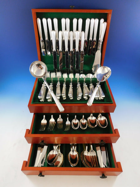 Superb Dinner Size Acropole by Cesa 1882 Italy 800 silver flatware set - 115 pieces. All of the pieces have hollow handles with a modern design of vertical ridges. This set includes:18 Dinner Size Knives w/pointed stainless blades, 9 3/4" 18 Dinner Size Forks, 8 1/8" 18 Dessert Knives w/pointed stainless blades, 8 1/4" 18 Dessert/Salad Forks, 7" 18 Teaspoons, 6 3/4" 18 Dinner Spoons, 8" 1 Fish Server, all-sterling, 11 3/8" 1 Fish Serving Fork, all-sterling, 9 5/8" 1 Salad Set with bone (some imperfections, as seen in photo), 9 1/4" 1 Soup Ladle, all-sterling, 12" 1 Vegetable Serving Spoon, all-sterling, 9 3/4" 1 Casserole Spoon, all-sterling, 10 5/8"