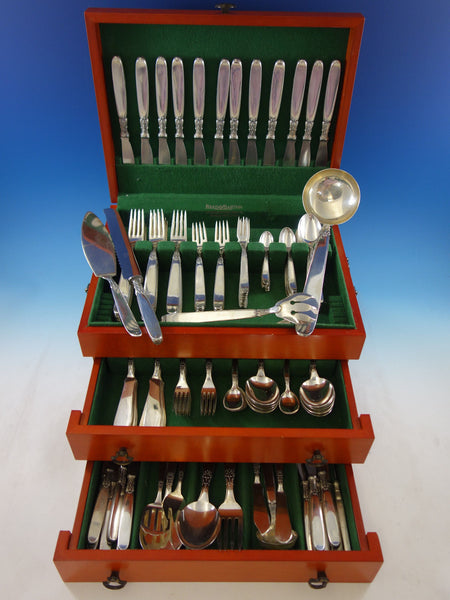 12 Dinner Knives, long handle, 8 3/4" 24 Dinner Forks, 7 5/8" 12 Luncheon Knives, long handle, 8" 12 Luncheon Forks, 6 1/2" 12 Salad Forks, 4-tine, 6 1/2" 10 Small Teaspoons, 4 1/2" 12 Place Soup Spoons, 6 1/2" 12 Cocktail Forks, 5 1/2" 12 Dinner Spoons, 7 3/4" 12 Fish Knives, flat handle all-sterling, 8" 12 Ice Cream Spoons, 4 5/8" 11 Demitasse Spoons, 3 7/8" 1 Fish Server, all-sterling, 10" 1 Gravy Ladle, 7 1/2" 1 Flat Handle Master Butter, pointed, 7 1/2" 1 Flat Handle Master Butter, rounded, 7 3/8" 1 Tomato Server, not pierced, 8 1/2" 1 Bread Knife w/stainless blade, 12" 1 Vegetable Serving Set, 2-pc, 9 3/4" 1 Ice Tongs, 8 1/2" 1 Soup Ladle, 12 1/2" 1 Petit Four Server, pierced, 5 3/4" 1 Beef Fork, 3-tine, 5 3/4"