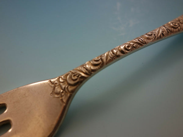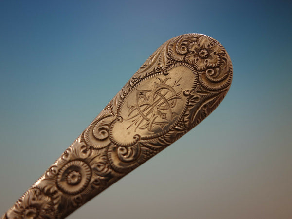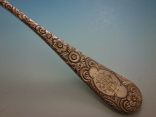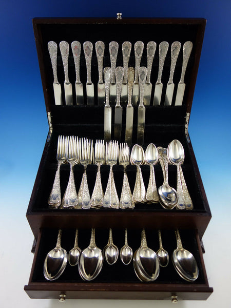 Monumental Antique Chased custom engraved pattern by Gorham sterling silver Flatware set, 112 pieces. This scarce pattern is not shown in any of our books. It is completely hand chased and has a cartouche in the center with intricate matching monogram. This set includes: