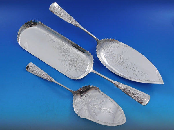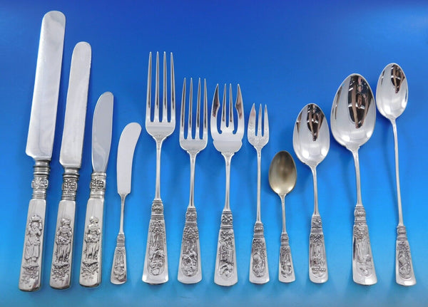 The academic nature in which designer Antione Heller looked to the past for inspiration also stems from the Beaux Arts movement. This multi-motif, figural pattern features French court of Fontainebleau, palace of King Francis I, with figures in court dress in varying food-related themes in feast or dinner service, and was introduced by Gorham in the year 1882.