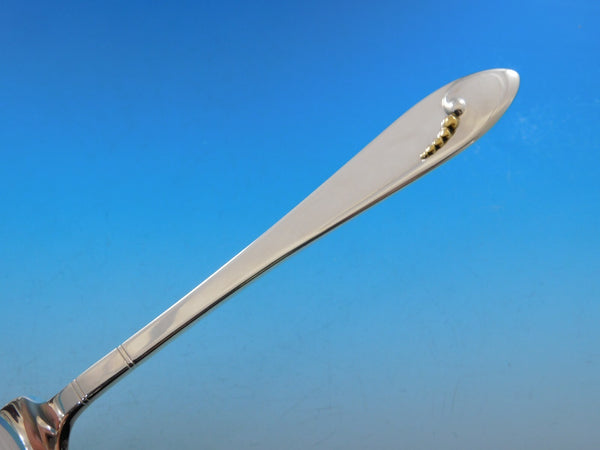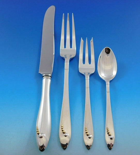 Handmade "Golden Caviar" by Black, Starr, Gorham sterling silver Flatware set, 99 pieces. The handle is pointed with a sweeping graduated design of gilded beads. This set includes: