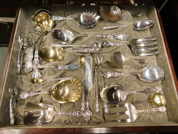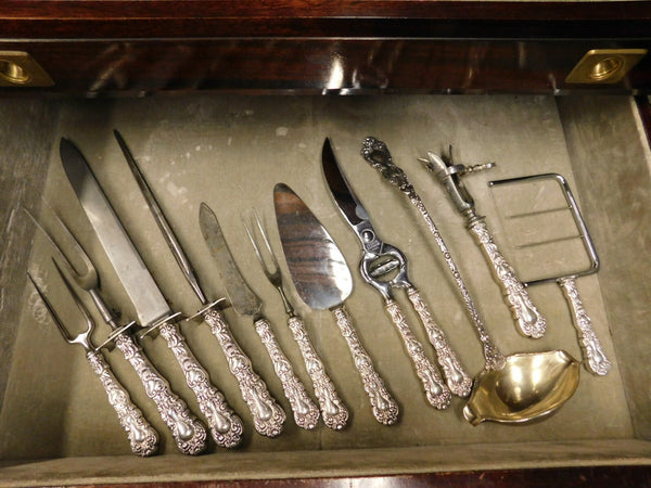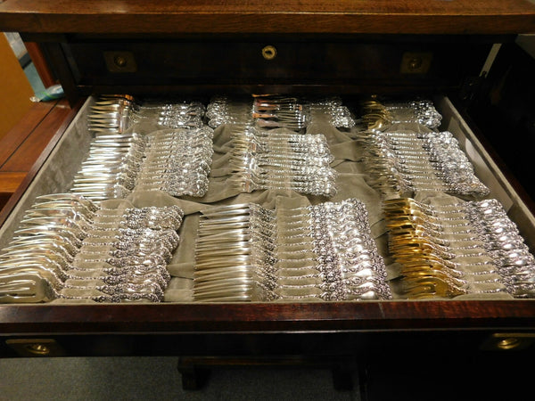 12 Dinner Size Knives, blunt, 9 5/8"12 Regular Knives, blunt, 8 1/2"12 Flat Handle Butter Spreaders, wide, 6 1/2"12 Flat Handle Butter Spreaders, narrow, 5 3/4"12 Fish Knives, flat handle all-sterling, 8"12 Nut Picks, 4 3/4"12 Fruit Knives, flat handle all-sterling, 5 3/4"12 Dinner Size Forks, 7 5/8"12 Regular Forks, 6 3/4"12 Dessert Forks, 4-tine, gold-washed, 5 3/4"12 Fish Forks, 6 5/8"12 Ice Cream Forks, gold-washed, 4 3/4"12 Lobster Forks, 3-tine, 5 3/8"12 Salad Forks, 6 3/4"12 Cocktail Forks, 5 3/8"12 Strawberry Forks, 3-tine, 4 3/4"12 Coffee Spoons, 5"12 Bouillon Soup Spoons, 4 3/4"12 Grapefruit Spoons, gold-washed, 5 3/4"12 Chocolate Spoons, 4"12 Demitasse Spoons, 4 1/8"12 Egg Spoons, gold-washed, 4 3/4"12 Gumbo Soup Spoons, 6 5/8"12 Salt Spoons, 2 5/8"12 Place Soup Spoons, 7"12 Large Dinner Spoons, 8 1/2"12 Teaspoons, 5 3/4"12 Iced Tea Spoons, 8 1/2"12 Orange Spoons, 5 1/2"1 Rice Spoon, hollow handle all-sterling, 8 3/4"1 Asparagus Serving Fork, 9"1 Berry Scoop, 8 3/4"1 Berry Spoon, gold-washed, 8 3/4"1 Berry Spoon, 8 5/8"1 Cake Saw, flat handle all-sterling, 10 3/8"1 Large Cheese Scoop, 8"1 Tomato Server, 8"1 Soup Ladle, 12 1/2"1 Oyster Ladle, gold-washed, 10 3/4"1 Ice Tongs, 6 1/4"1 Saratoga Chip Server, 5 3/4"1 Sauce Ladle, gold-washed, 5 3/8"1 Salad Serving Fork, 10"1 Salad Serving Spoon, 10"1 Ice Cream Slice, 10 3/8"1 Fish Serving Set, 2-pc, 11 1/2" 8 3/8"1 Roast Carving Knife, 13 5/8"1 Roast Carving Fork, 11"1 Roast Carving Hone, 9 1/2"1 Steak Carving Set, 3-pc, 8 3/8"1 Long Olive fork and spoon, 8 3/8"1 Short Olive Spoon and fork, 5 3/4"1 Horseradish spoon, gold-washed, 5 3/4"1 Flat Handle Master Butter, 7 5/8"1 Macaroni Server, 8 1/4"1 Cheese Plane, 8"1 Cracker Scoop, 7 3/4"1 Vegetable Spoon, pointed, 9"1 Sugar tong, vermeil, 4 1/8"1 Sherbet Server, 8 3/8"1 Beef Fork, 6 3/4"1 Cheese Scoop, 5 7/8"1 Chocolate Muddler, 8 1/4"1 Cake Server w/plated blade, 9 7/8"1 Toast Fork, 7 1/2"1 Poultry Shears w/steel implement, 11 1/4"1 Tea Strainer, 6"1 Sugar Sifter, 5 3/4"1 Sugar Tongs, 5 5/8"1 Cold Meat Fork, 7 1/8"1 Sardine Fork, 5 1/2"1 Master Salt Spoon, gold-washed, 3 1/2"1 Stuffing spoon w/button, 12 1/4"1 Sugar Spoon, gold-washed, 5 3/4"1 Gravy Ladle, gold-washed, 7"1 Ice Tongs, 5"1 Pea Spoon, 8 3/4"1 Pickle/Pastry Fork, 5 3/4"1 Preserve Spoon, 7 1/8"1 Lettuce Fork, 9 1/4"1 Cold Meat Fork, 8 1/8"1 Mustard Ladle, 4 1/4"1 Bone Holder, 8 1/4"1 Punch Ladle, 12 1/2"1 Nut Spoon, gold-washed, 4 5/8"1 Butter Pick, 5 7/8"1 Pickle Knife, 6 7/8"1 Waffle Server, 7 7/8"1 Confection Spoon, gold-washed, 5 5/8"1 Caviar Scoop, 4 1/8"1 Fish Serving Fork, 7 5/8"1 Sharpener wheel, 8 1/8" Includes a fabulous impressive 10-drawer fitted storage cabinet. This chest is massive with the dimensions of 52" tall, 25.5" wide and 23.5" deep.