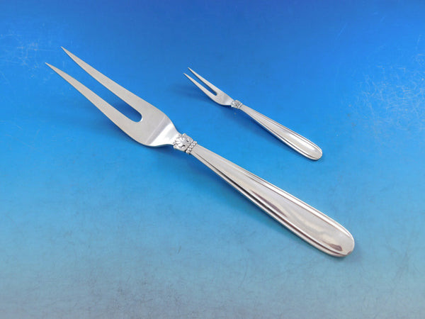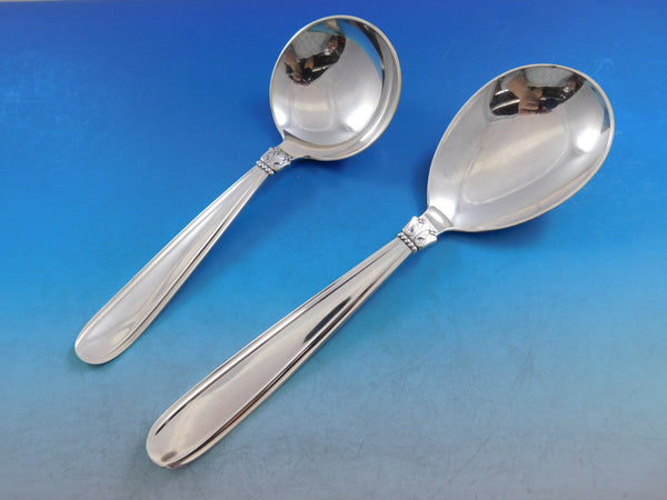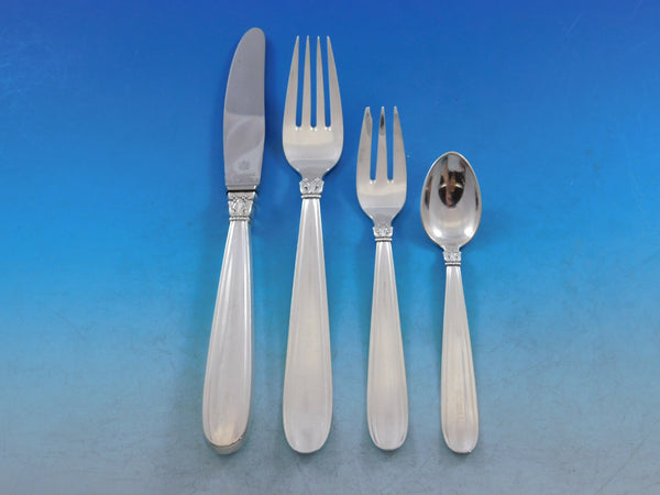 Modern design KARINA BY WS SORENSEN Danish sterling silver Flatware set - 116 Pieces. This set includes:12 LUNCHEON KNIVES, 7 3/4" 12 LUNCHEON FORKS, 6 7/8" 12 DESSERT FORKS, 3-TINE, 5 1/2" 12 COFFEE SPOONS, 4 1/2" 12 PLACE SOUP SPOONS, 6 7/8" 12 FISH KNIVES ALL-STERLING, 8" 12 FISH FORKS, 7" 12 LOBSTER PICKS, 7 5/8" 1 GRAVY LADLE, 7 1/8" 1 COLD MEAT FORK, 2-TINE, 8 1/2" 1 SUGAR SPOON, SMALL, 4 5/8" 1 HOLLOW HANDLE ALL-STERLING MASTER BUTTER, 6 3/4" 1 LEMON FORK, 4 1/8" 1 LARGE BERRY SPOON, 9 1/2" 1 SERVING SPOON W/ROUND BOWL, 7 5/8" 1 SUGAR TONG, 4 1/8" PLUS 12 FRUIT KNIVES (UNKNOWN DANISH PATTERN), 6 1/8" Includes bonus brand new storage chest - styles vary.