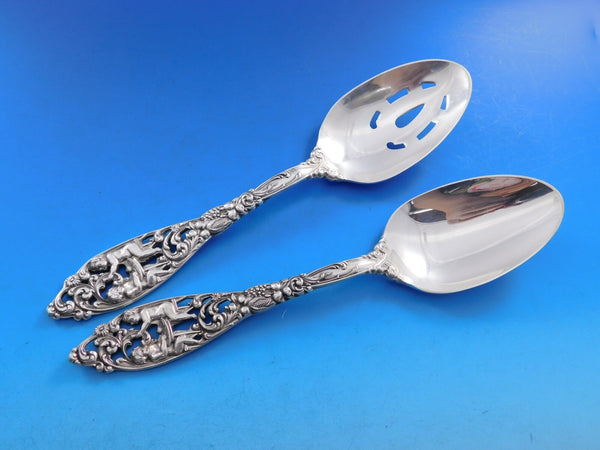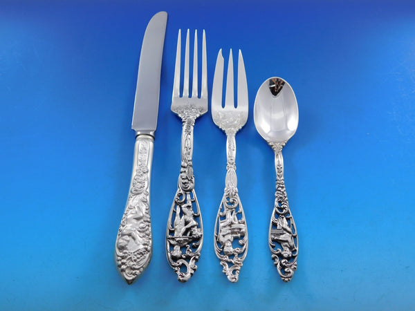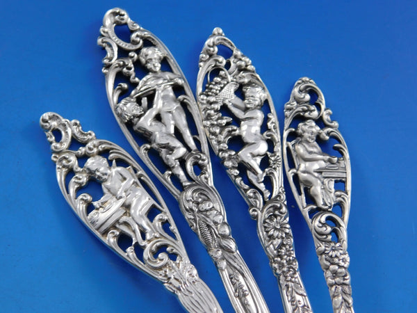 Rare Labors of Cupid by Dominick and Haff sterling silver Flatware set - 52 pieces total. This pattern is a figural multi-motif pattern and was made in 16 different elaborate motif, each handle depicting cherubs engaged in food-related activities. This set includes: