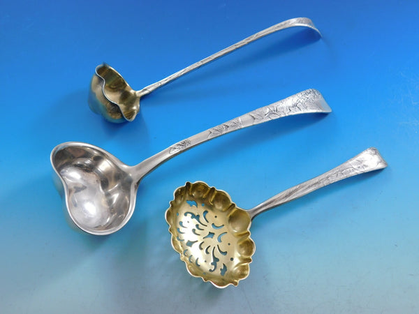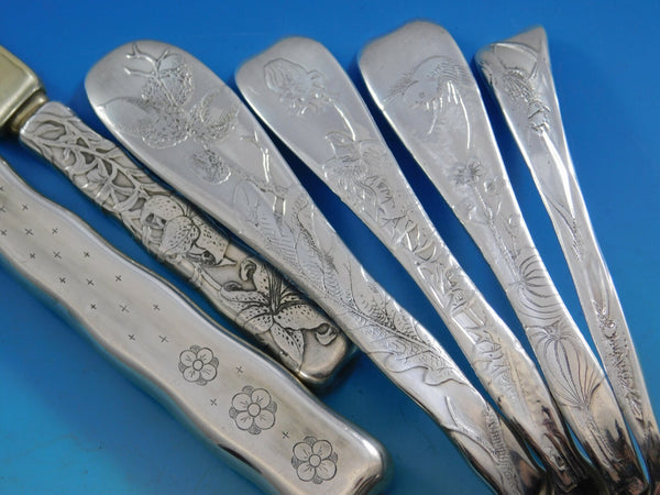Incredible museum quality Lap Over Edge by Tiffany Co., c1880, acid etched and engraved sterling silver Flatware set, 128 pieces. This set features varying Japanesque aesthetic acid etched and engraved masterfully created designs of birds, bugs, flowers, foliage, and geometric designs. This set includes: