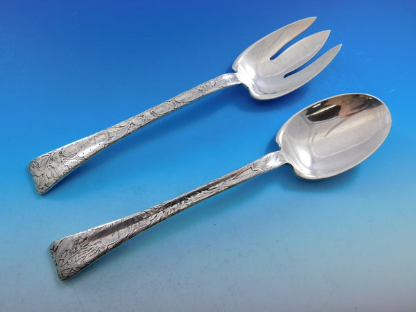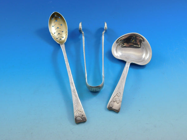 Designed by Charles Grosjean (1841-1888). Grosjean worked in his family's firm which produced high end silverware to prominent New York City retailers, including Tiffany. Upon his father's death, Grosjean left his family firm to become superintendent of Tiffany's silver factory in 1868. He had great background in silver and was an artist and was referred to as "one of the best living decorators of silver". He was a teacher in the Tiffany School and designed a few full lines of sterling patterns for Tiffany in his time with the company including Chrysanthemum and English King.