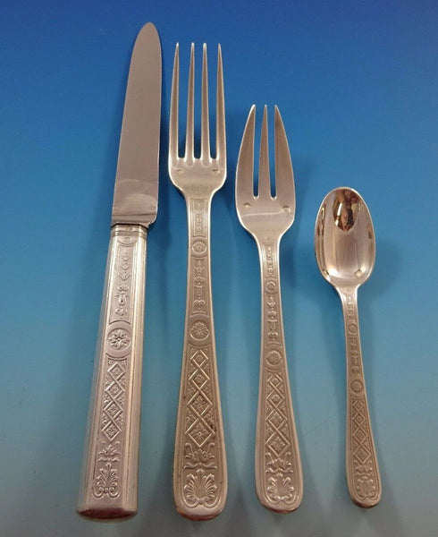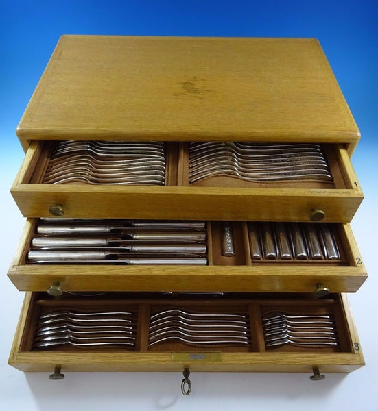 Superb LAUZUN by Puiforcat sterling silver flatware set, 77 pieces. This set includes:12 DINNER SIZE KNIVES, 9 5/8" 11 DINNER SIZE FORKS, 8 1/8" 12 LUNCHEON KNIVES, 8" 6 LUNCHEON FORKS, 6 5/8" 6 PLACE SOUP SPOONS, 6 5/8" 6 DESERT FORKS, 3-TINE, 5 1/2" 6 COFFEE SPOONS, 4 1/8" 7 DINNER SPOONS, 8 1/4" 6 ICE CREAM SPOONS, 5 1/2" 1 GRAVY LADLE, 7" 1 HOLLOW HANDLE MASTER BUTTER, 7 3/4" 1 PIE SERVER, ALL-STERLING, 9 1/2" 1 ICE CREAM SERVER, ALL-STERLING, 10" 1 SUGAR TONG, 4 1/2" Includes large vintage, fitted storage chest.