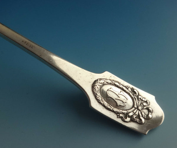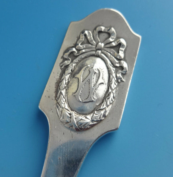 18 DINNER FORKS, 7 3/4" 8 LUNCHEON KNIVES, 8" 18 LUNCHEON FORKS, 6 7/8" 18 SALAD FORKS, 6" 14 TEASPOONS, 5 7/8" 17 BUTTER SPREADERS, 6 1/8" 18 COCKTAIL FORKS, 5 1/2" 18 BOUILLON SOUP SPOONS, 5" 1 PICKLE FORK, 6 7/8" 1 CAKE SERVER WITH STAINLESS IMPLEMENT, 10 1/4" 12 FRUIT FORKS, 6 1/8" 18 GUMBO SOUP SPOONS, 6 3/4" 18 ICE CREAM FORKS In two vintage boxes beautiful pattern w/ bow & wreath acid-etched "W" monogram